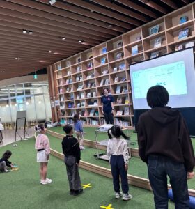 プロジェクター映像を活用し、実際に動きを見せたり数字ディスクを並べたりすることで、お子さまたちが興味を持って集まり、参加につながりました。